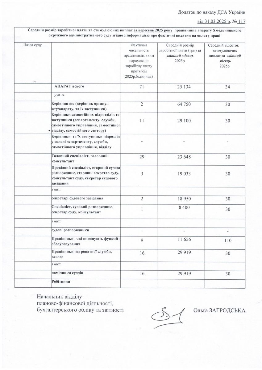 9 Жовтня 2025 р. Середній розмір заробітної плати та стимулюючих виплат за вересень 2025 року працівників апарату суду