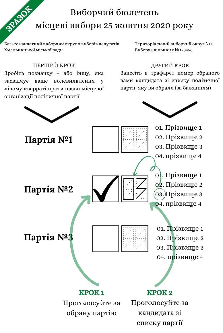 При здійсненні волевиявлення потрібно буде зробити дві дії: поставити відмітку (ü або +) біля назви партії та вписати поруч номер кандидата. Список кандидатів буде опубліковано біля квадратиків для голосування.