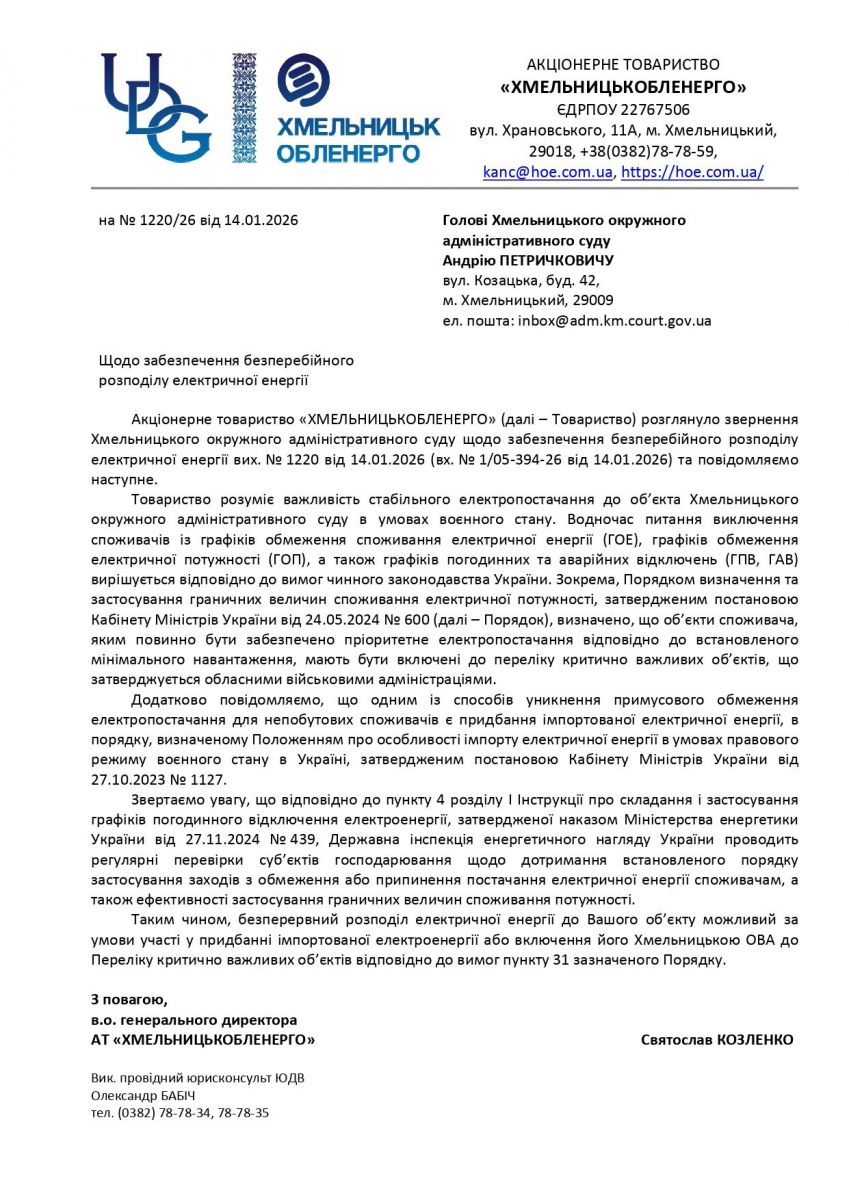 27 Січня 2026 р. До відома громадян та юридичних осіб надаємо лист АТ "Хмельницькобленерго" про забезпечення суду безперебійним електропостачанням